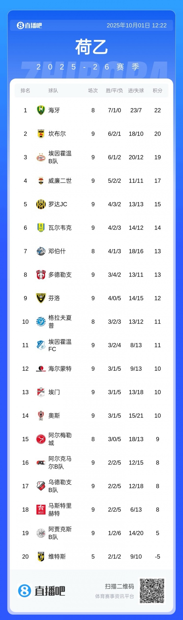 • 艱難拿分!荷乙維特斯本賽季-12分開局,5輪過后積分為-5分