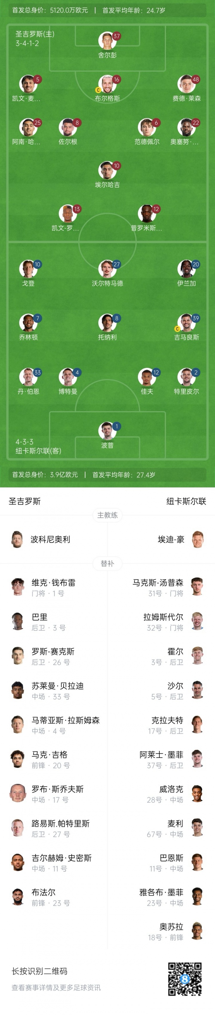 紐卡斯爾聯(lián)首發(fā):1-波普、4-博特曼、12-佳夫、33-丹-伯恩、2-特里皮爾、7-喬林頓、8-托納利、39-吉馬良斯、10-戈登、20-伊蘭加、27-沃爾特馬德