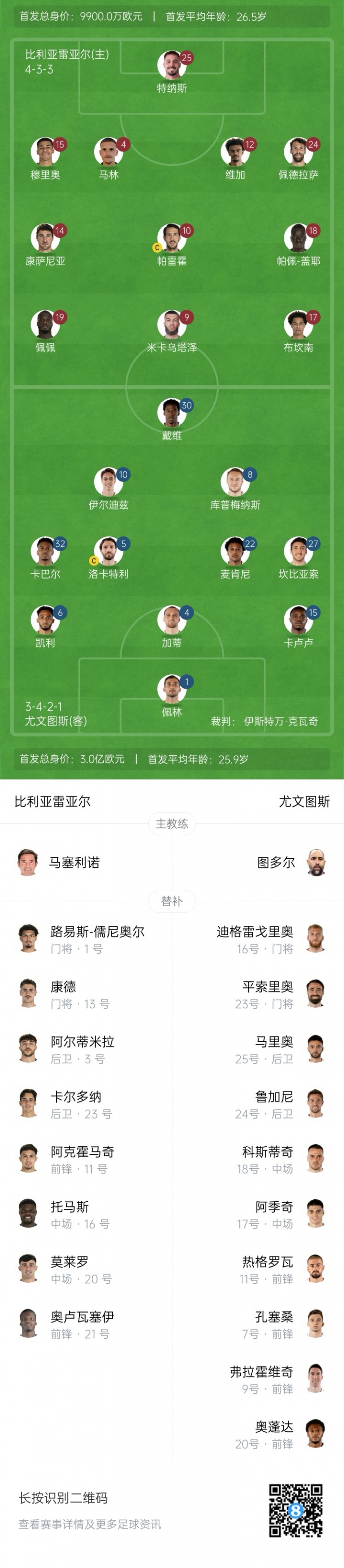 比利亞雷亞爾首發(fā):25-特納斯、4-馬林、12-維加、15-穆里奧、24-佩德拉薩、10-帕雷霍、14-康薩尼亞、18-帕佩·蓋耶、9-米卡烏塔澤、17-布坎南、19-佩佩